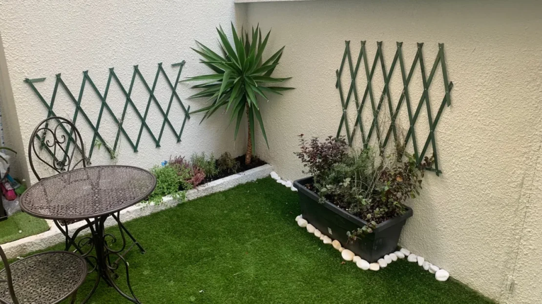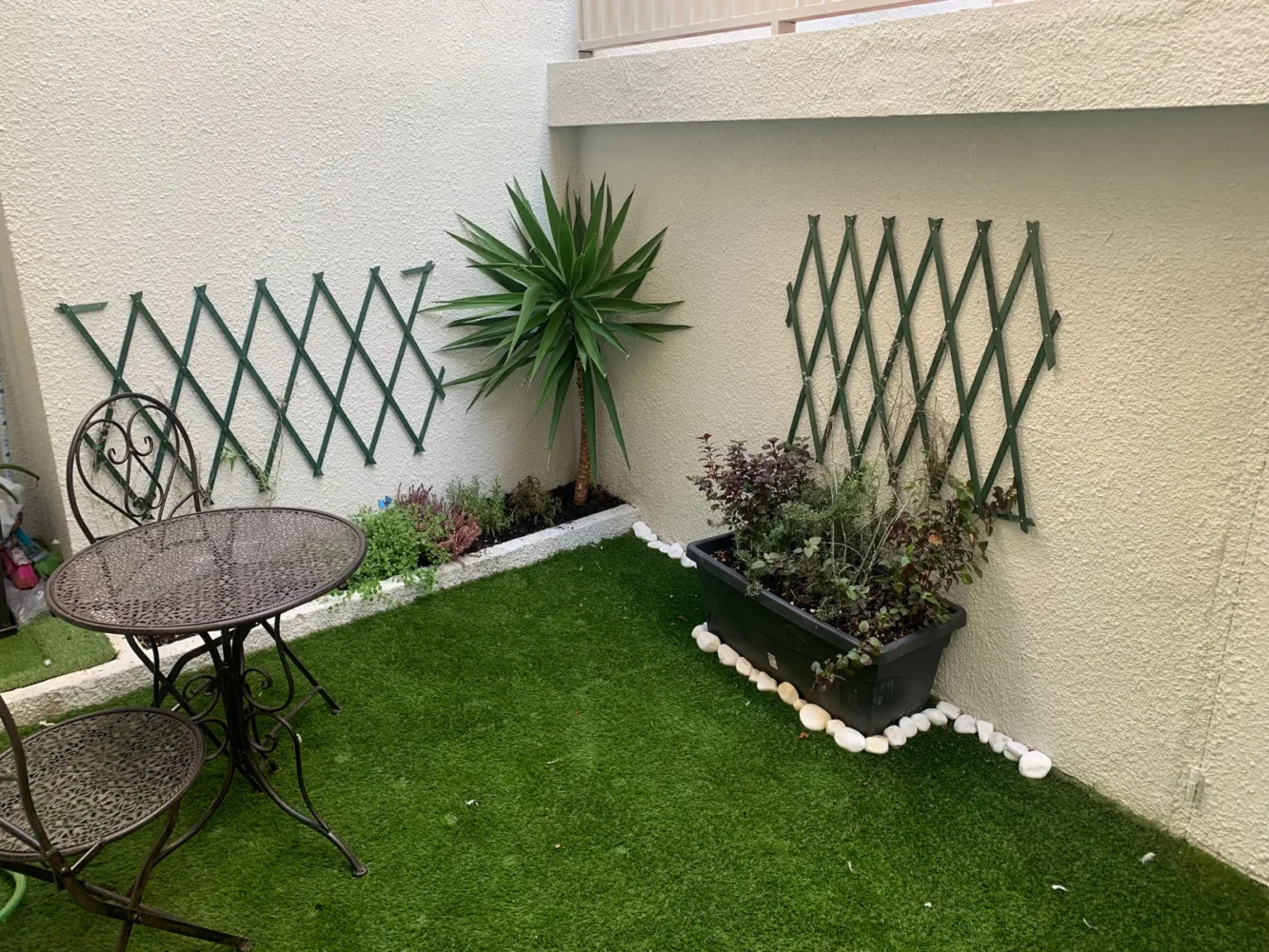 •Ακάλυπτο χώρο στην πίσω πλευρά, με τεχνητό γρασίδι και χώρο για φυτά, κατάλληλο για χαλάρωση, διάβασμα ή μικρό καφέ σε ήσυχο περιβάλλον