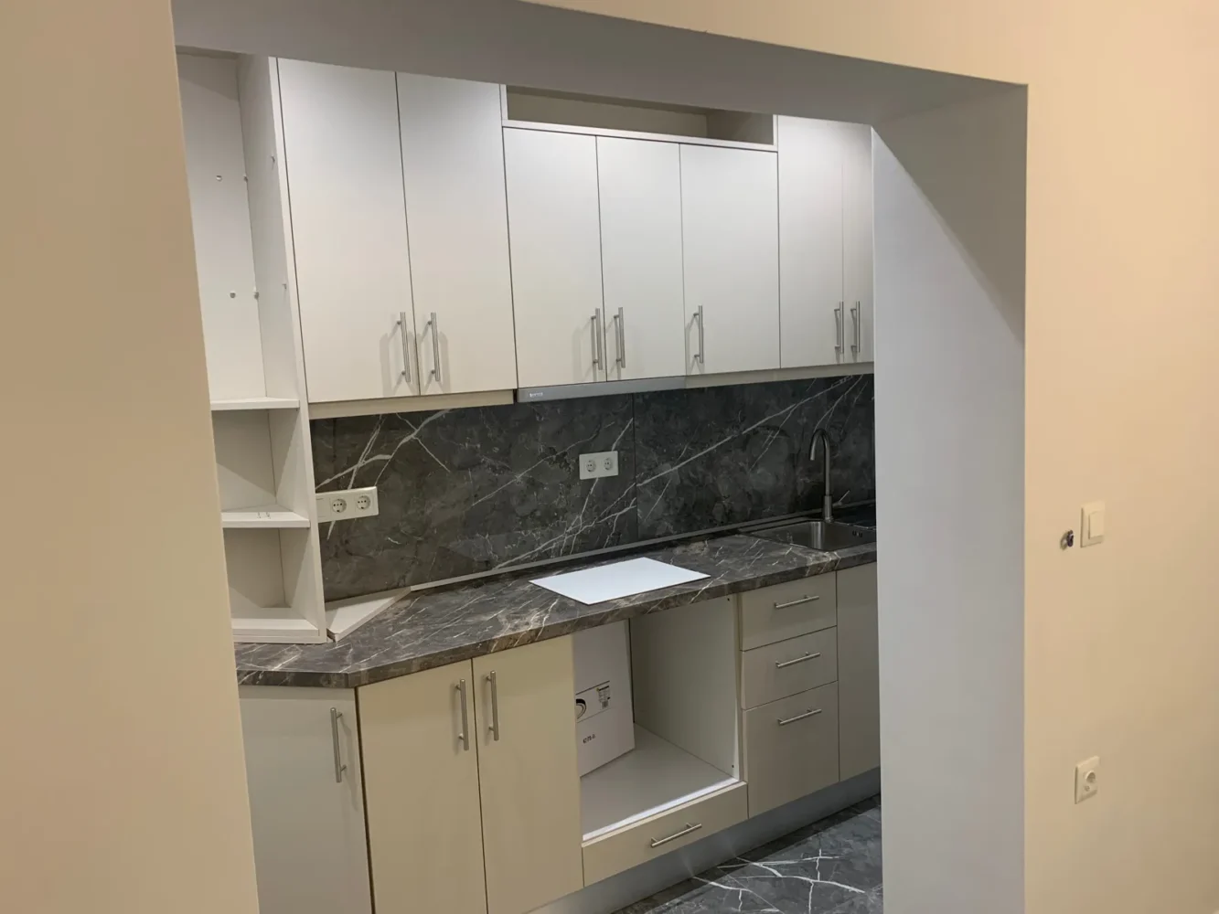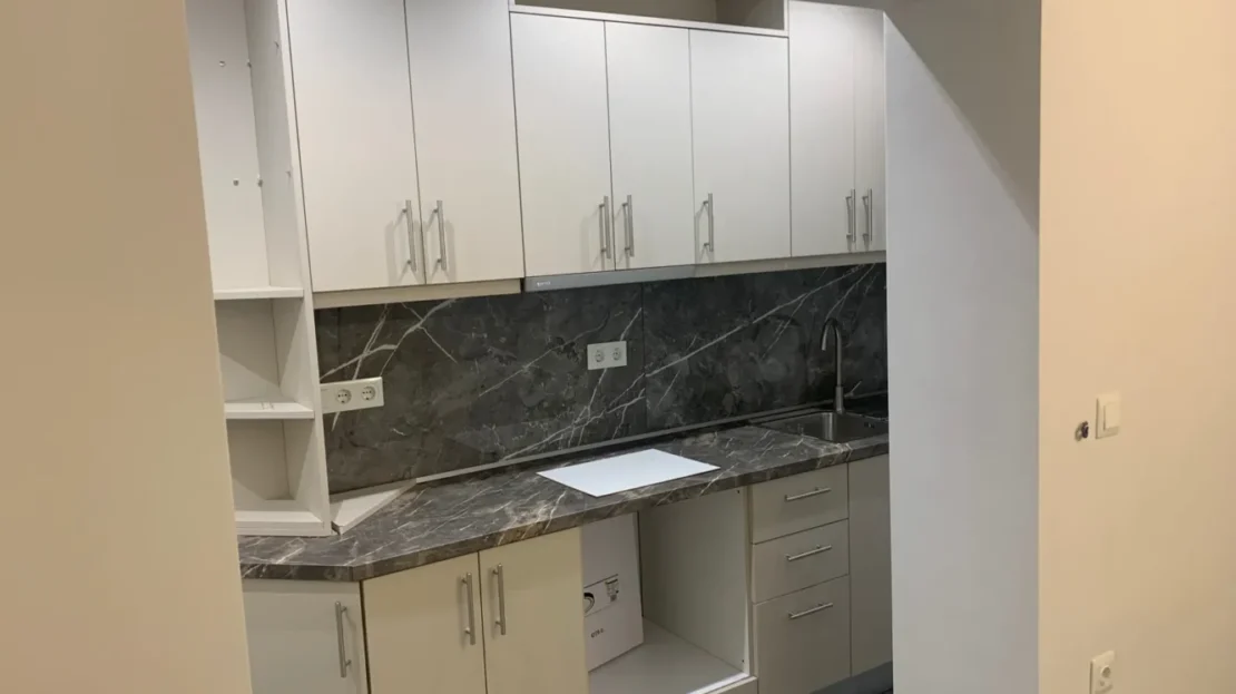 •Επιπλωμένη κουζίνα με ντουλάπια και πάγκο