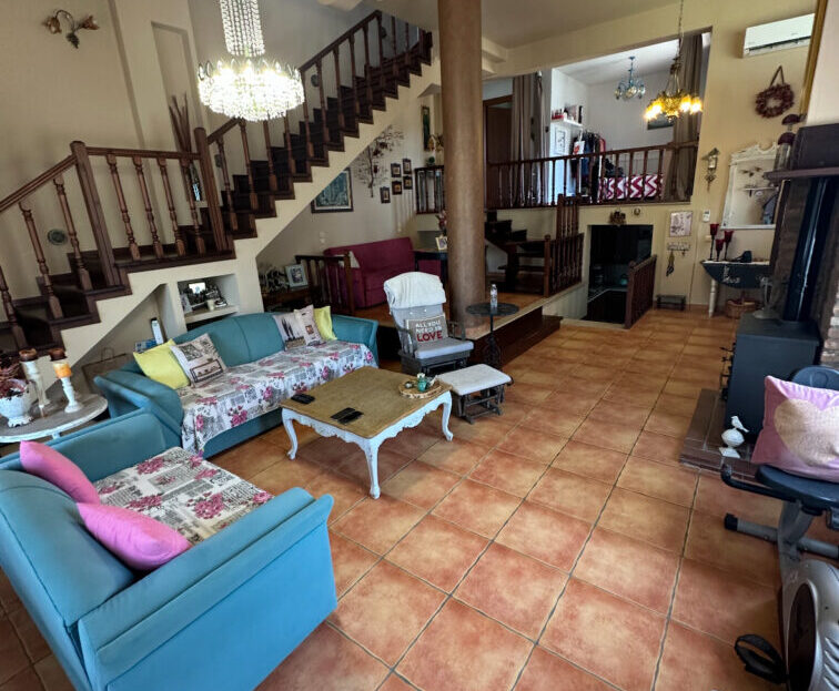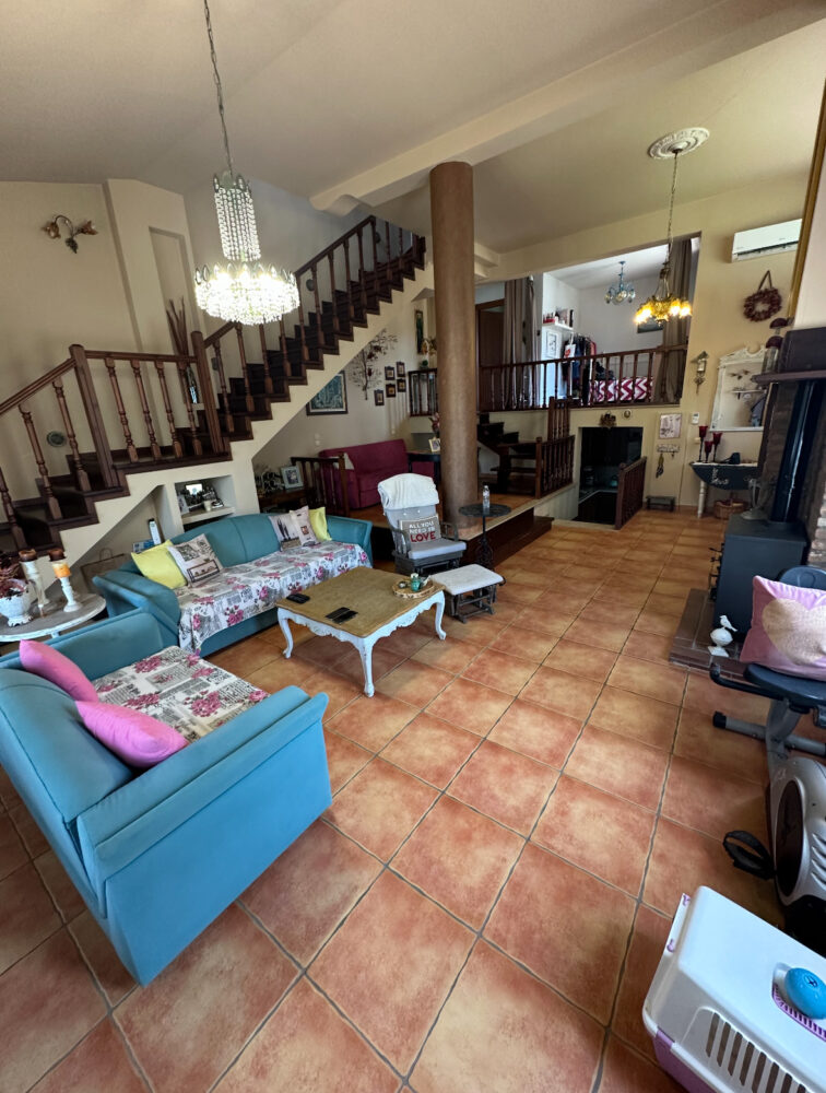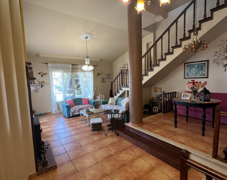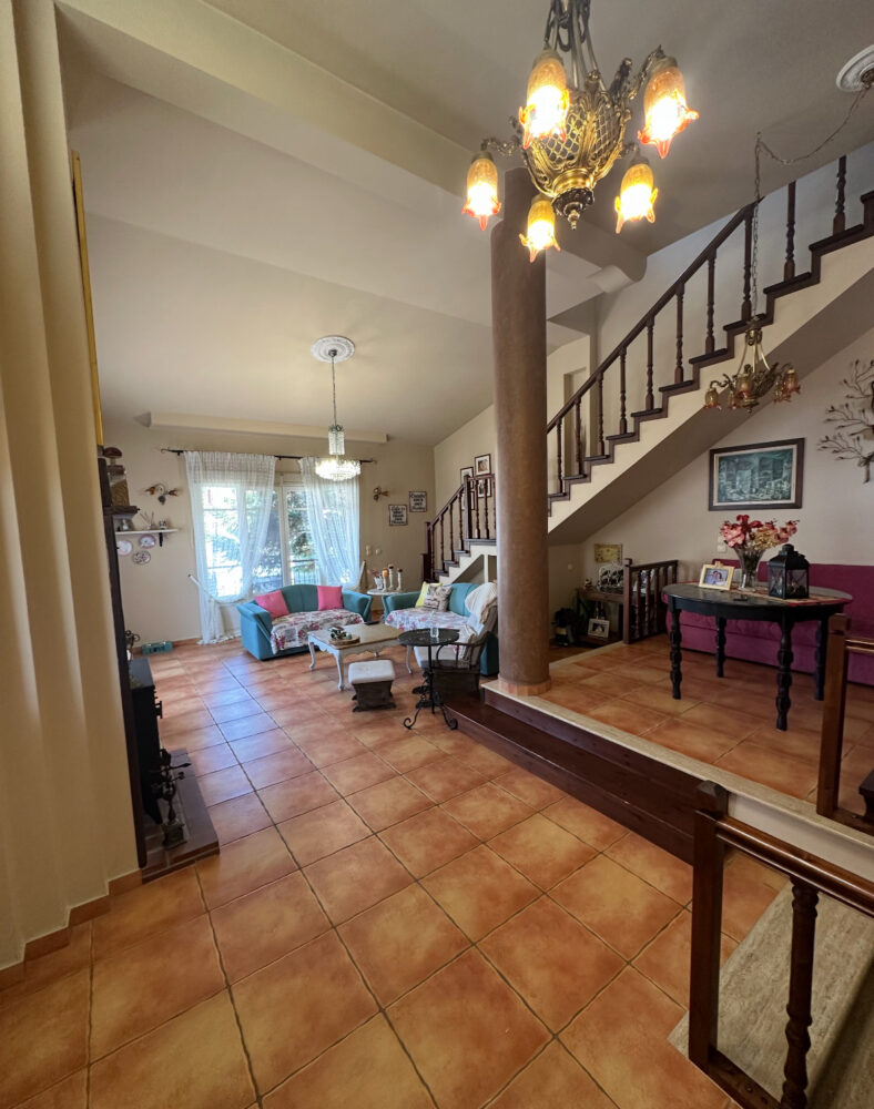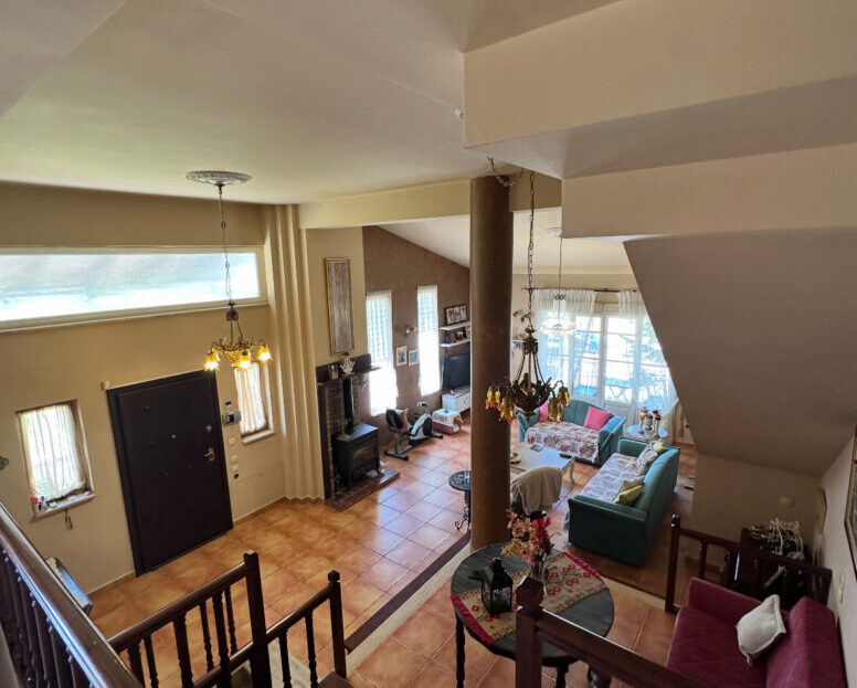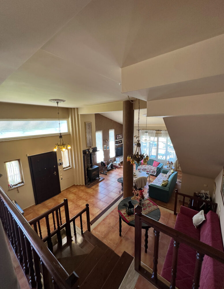 Στον πρώτο όροφο υπάρχει ευρύχωρο σαλόνι και τραπεζαρία με ξυλόσομπα, σε έναν όμορφα σχεδιασμένο χώρο με πολύ ψηλό ταβάνι και πλακάκια στο πάτωμα. Περιλαμβάνει πόρτα ασφαλείας, σύστημα συναγερμού, θυροτηλεόραση, κλιματιστικά της Gree, χειροποίητα φωτιστικά από μπρούτζο, απλίκες από φυσικό φυσητό γυαλί και προεγκατάσταση για μπαρ και ψυγείο στην τραπεζαρία.