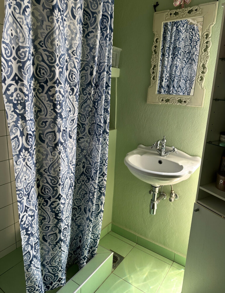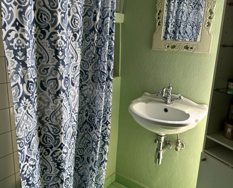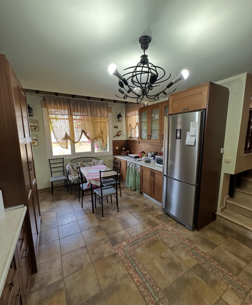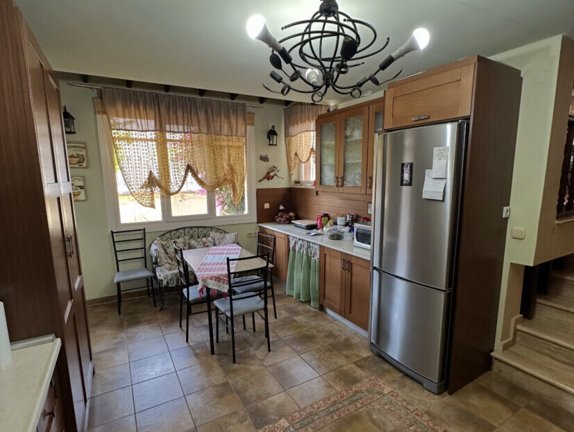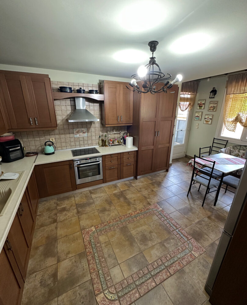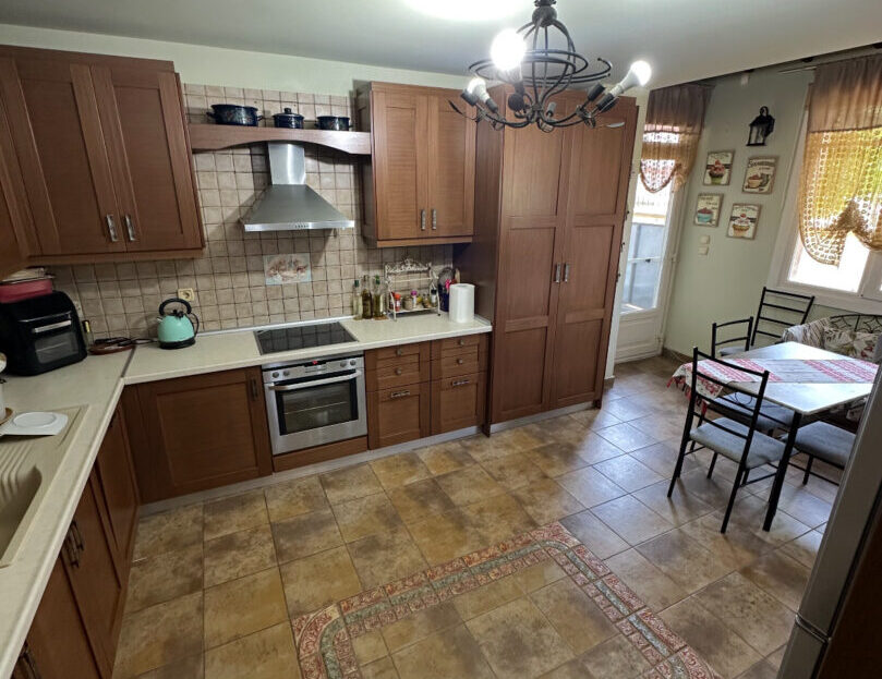 Προχωρώντας μέσα από το σαλόνι, φτάνουμε στην κουζίνα — έναν μεγάλο και φωτεινό χώρο με ξύλινη κουζίνα πλήρως εξοπλισμένη με εντοιχισμένες ηλεκτρικές συσκευές όπως φούρνο, εστία και πλυντήριο πιάτων. Περιλαμβάνει επίσης ψυγειοκαταψύκτη και φούρνο μικροκυμάτων. Υπάρχει και χώρος πλυντηρίου εξοπλισμένος με πλυντήριο και στεγνωτήριο 8 κιλών. Στο υπόγειο υπάρχει διάδρομος γυμναστικής και επιπλέον αποθηκευτικοί χώροι.